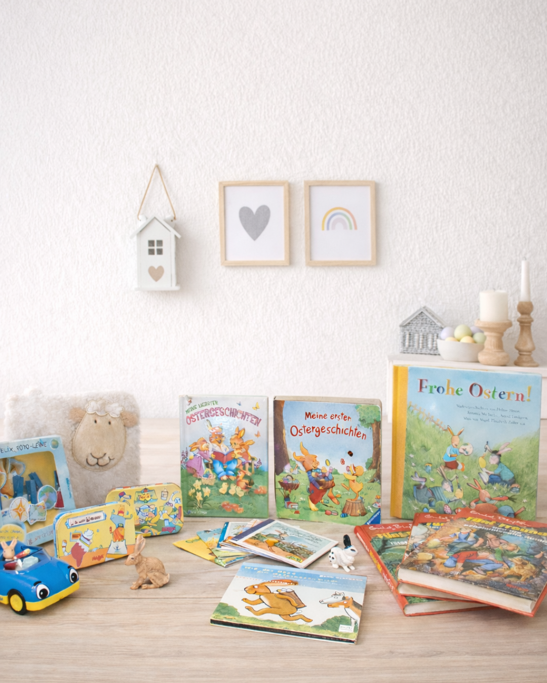 Spielen und Geschichten erfinden: Mit kleinen Spielzeugtieren – zum Beispiel Hasen – könnt ihr eure eigenen Ostergeschichten erfinden. Spielen und Erzählen gehört bei uns einfach dazu.